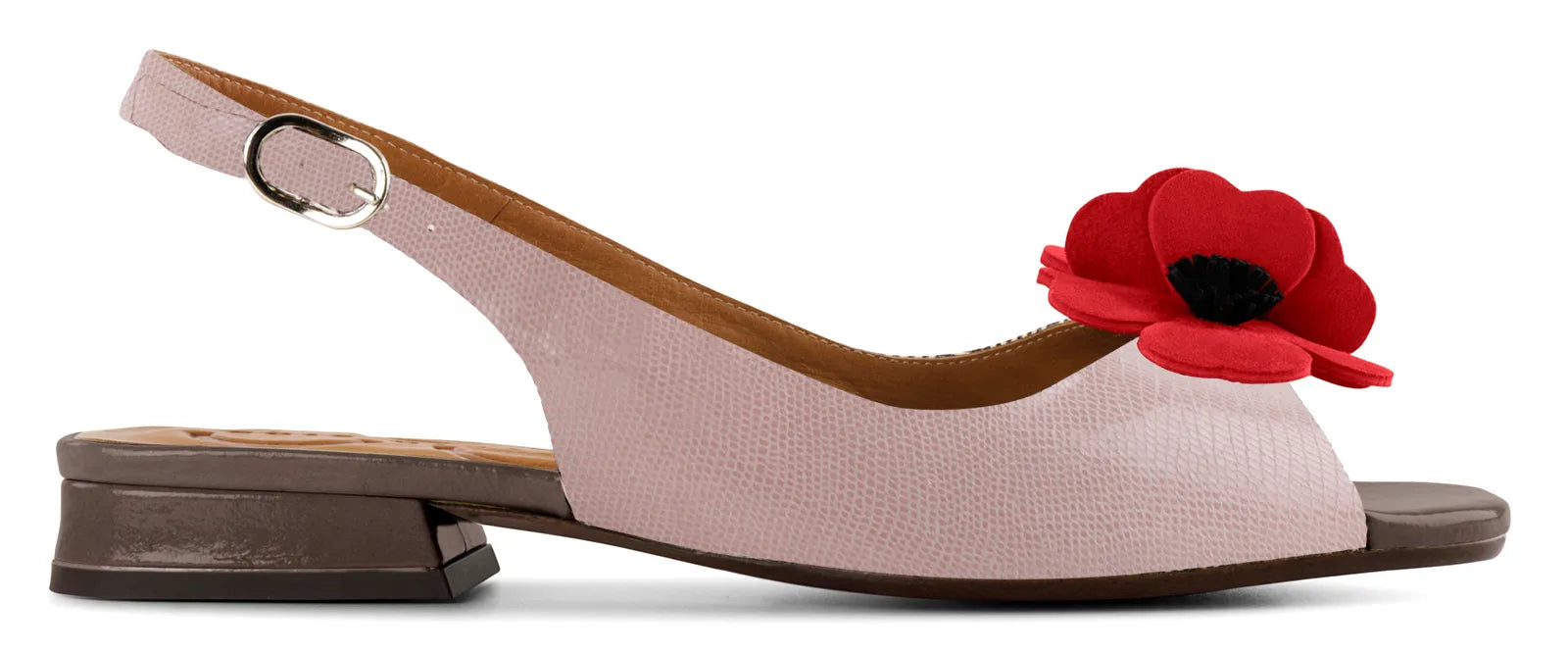 女士低跟皮革凉鞋,花朵装饰,搭扣闭合。