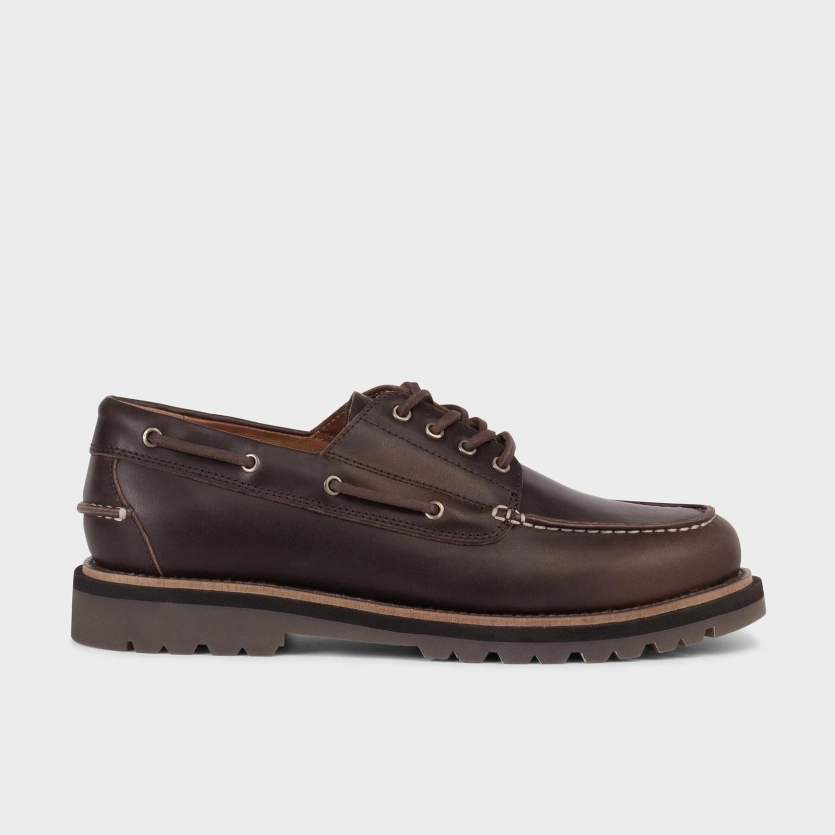Los Vagabond Jay reinterpretan el estilo náutico clásico con un aire robusto inspirado en el calzado de trabajo. Están confeccionados en cuero pull-up marrón oscuro con cordones de cuero y suela estriada de 15 mm que aporta comodidad y durabilidad. Su puntera redondeada y las costuras tipo mocasín refuerzan su carácter atemporal, mientras que los acabados en piel curtida sin cromo ofrecen confort y un diseño responsable.