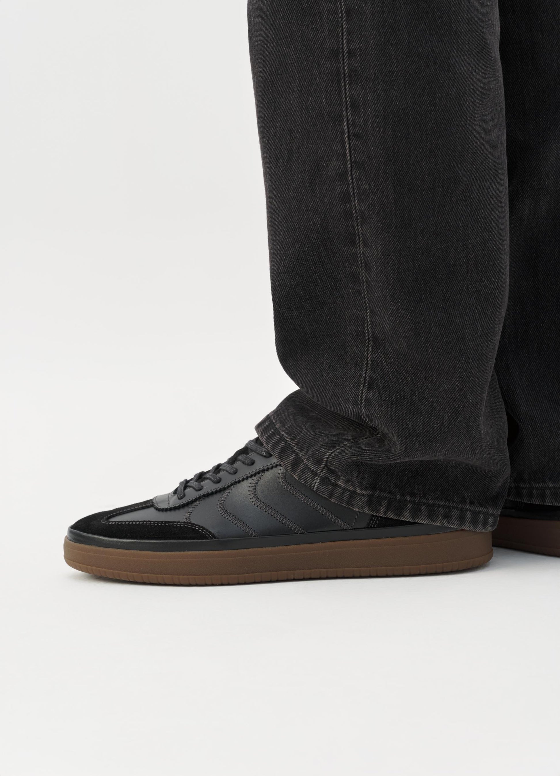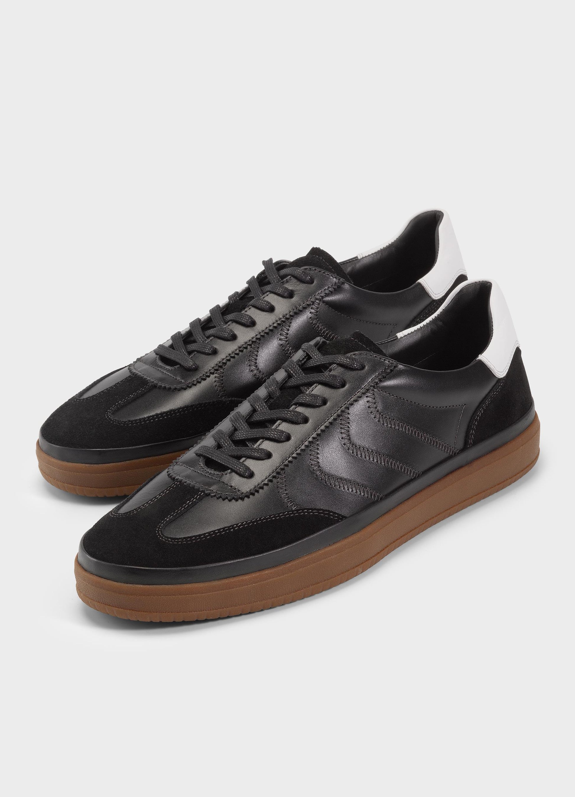 Las Leo de Vagabond son unas sneakers modernas con un marcado estilo deportivo. Están confeccionadas en cuero negro con detalles de ante, puntera en forma de T y suela de goma marrón, lo que aporta un diseño urbano y versátil. Incorporan cierre de cordones y plantilla de cuero para mayor comodidad en el uso diario.