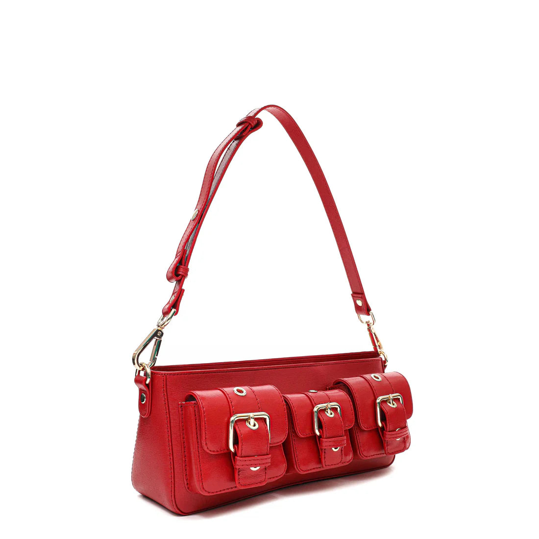 这款包采用亮红色,可单肩背,配有三个设计独特的实用口袋。