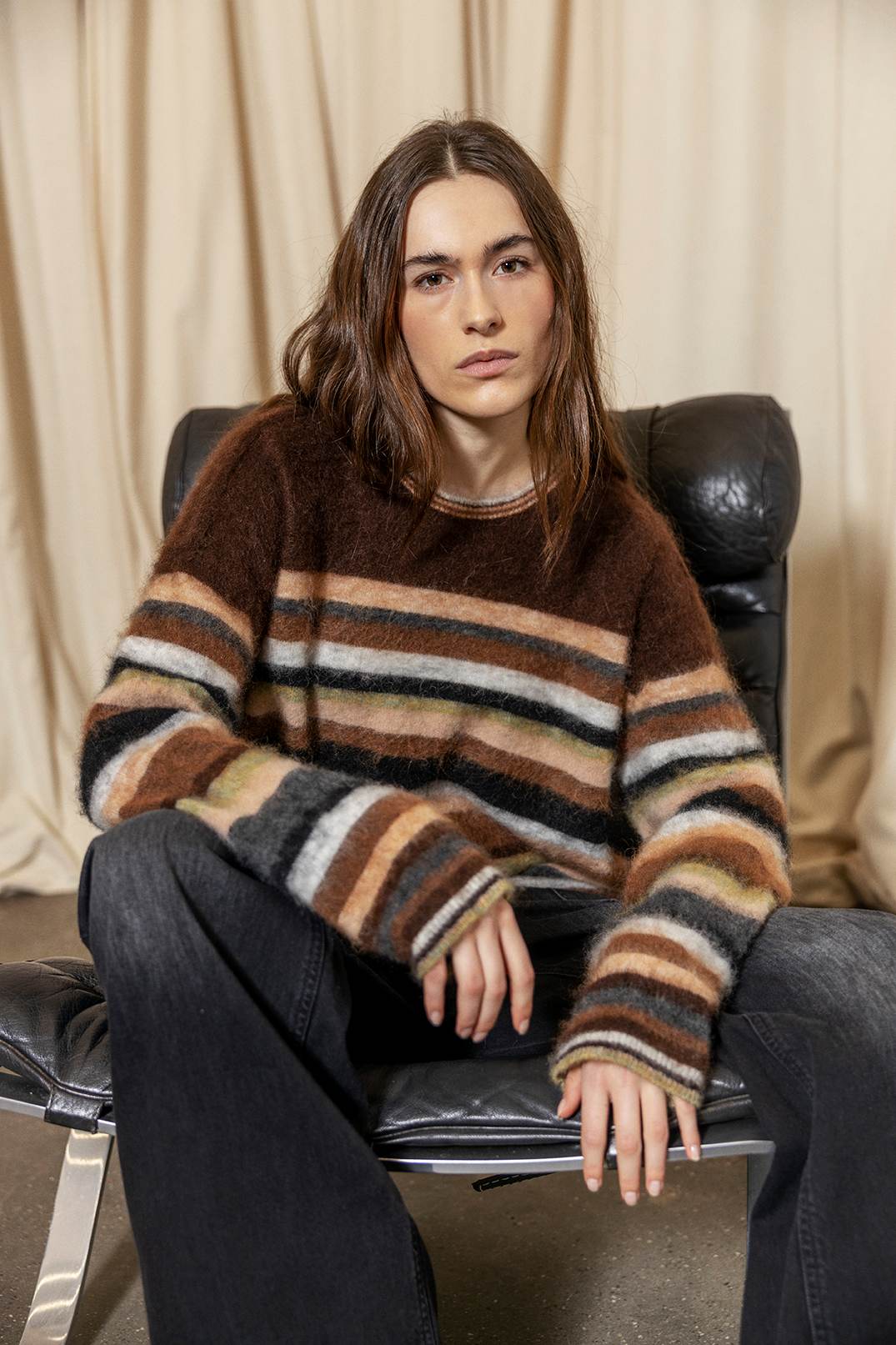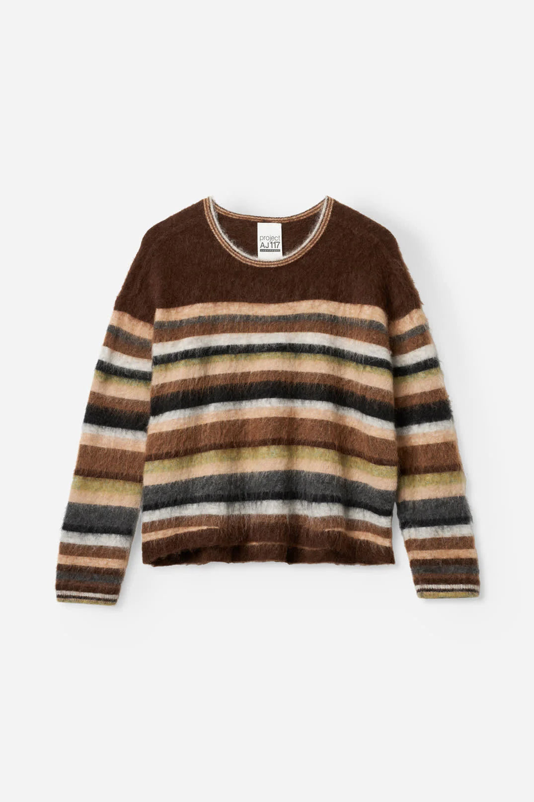 El Bolette Knit Pullover de Project AJ117 es un jersey de rayas super suave confeccionado en una mezcla de mohair, lana y fibras sostenibles. Su hilo cepillado aporta volumen y calidez sin resultar pesado. Diseñado con corte relajado, hombros caídos y cuello redondeado con detalles contrastantes, este jersey es un imprescindible de la temporada en una paleta de rayas audaz y multicolor. Se puede combinar con el gorro y guantes a juego para un conjunto coordinado, y está disponible también en versión larga Bobbie. La lana utilizada está certificada RWS (Responsible Wool Standard) para garantizar sostenibilidad y calidad.