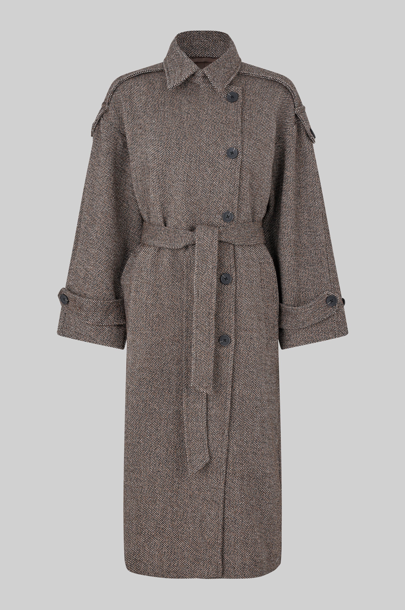 Abrigo largo de tweed Second Female. El abrigo está confeccionado en mezcla de lana con estampado de tweed. Presenta cuello clásico con cierre de solapa y botones descentrados. Cinturón de tela para anudar en la cintura y tirantes y botones en hombros y puños. Dos bolsillos laterales y abertura en la espalda. Totalmente forrado. Corte clásico que se puede ajustar con el cinturón.