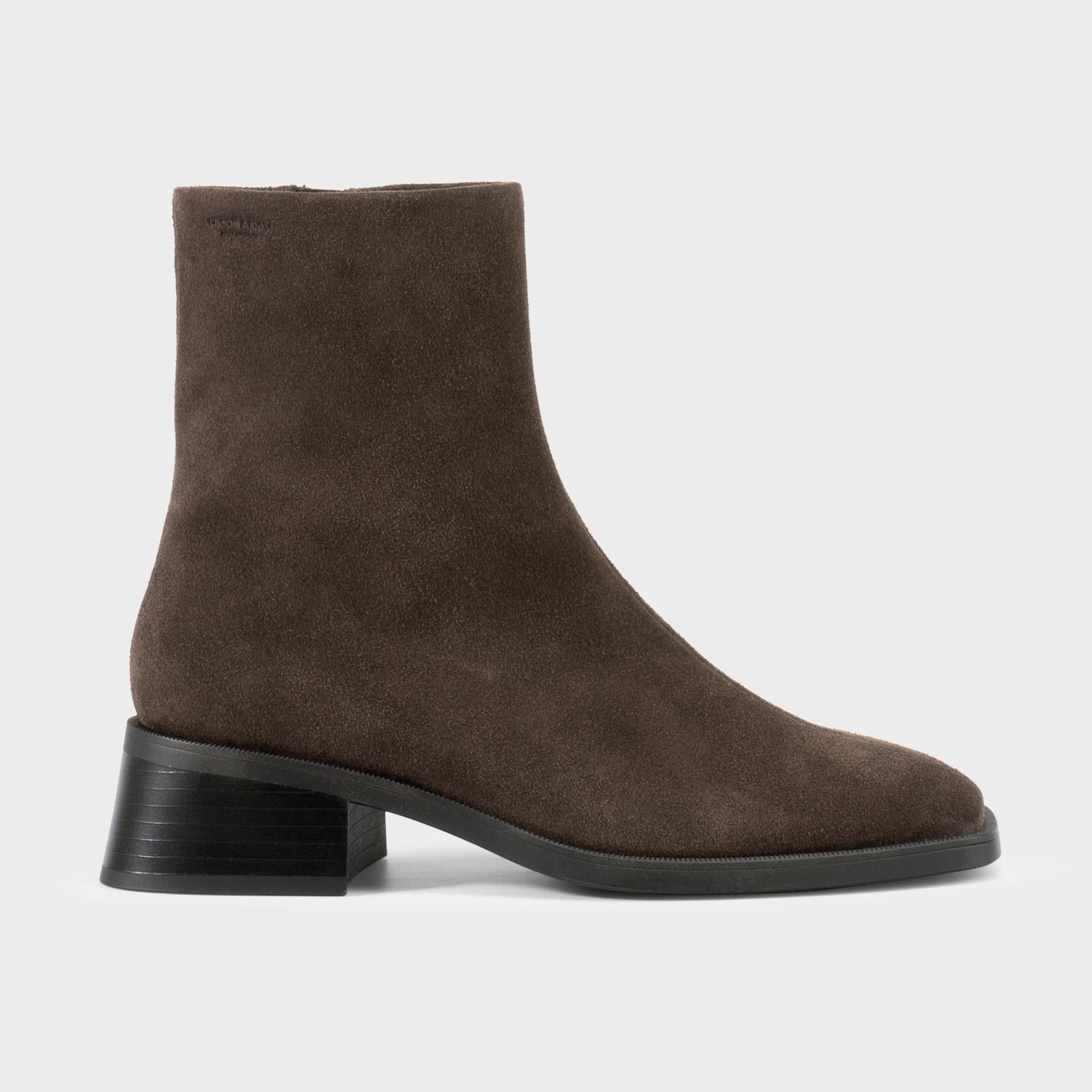 El modelo Blanca de Vagabond es un verdadero icono de la marca, reconocido por su puntera ligeramente cuadrada y su costura central. Está confeccionado en ante marrón oscuro y se complementa con un cómodo tacón acampanado de 47 mm y cierre lateral con cremallera. La plantilla de cuero sin cromo garantiza suavidad y transpirabilidad.