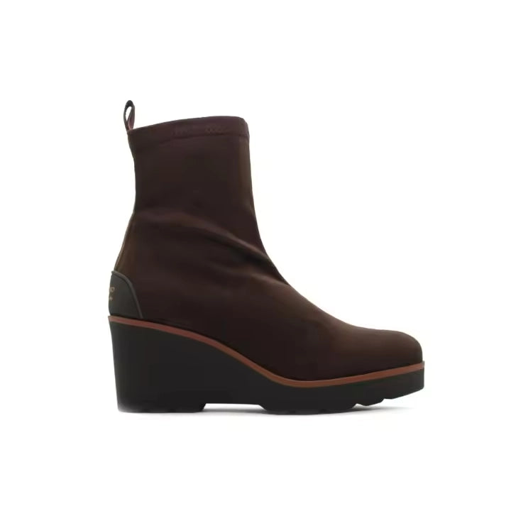 Botín de tejido elástico efecto ante en color marrón con cuña alta y plataforma. Una propuesta sobria y cómoda, perfecta para estilizar la silueta con elegancia.CARACTERÍSTICAS DEL PRODUCTO