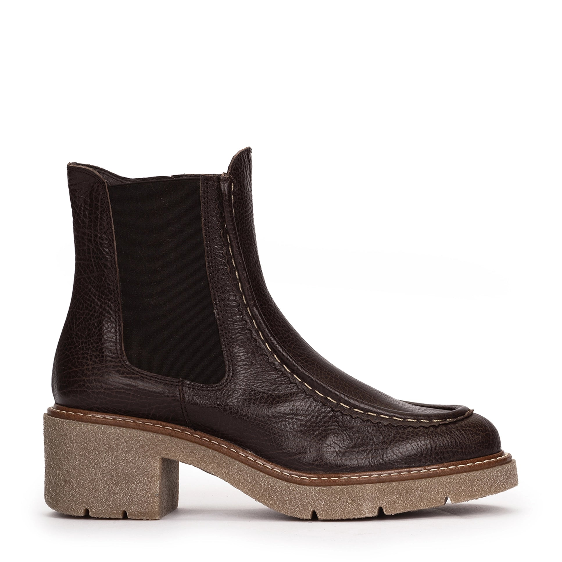 Botín chelsea de piel grabada en color camel con elásticos laterales y tacón medio texturizado. Una versión refinada del clásico chelsea con detalles únicos.