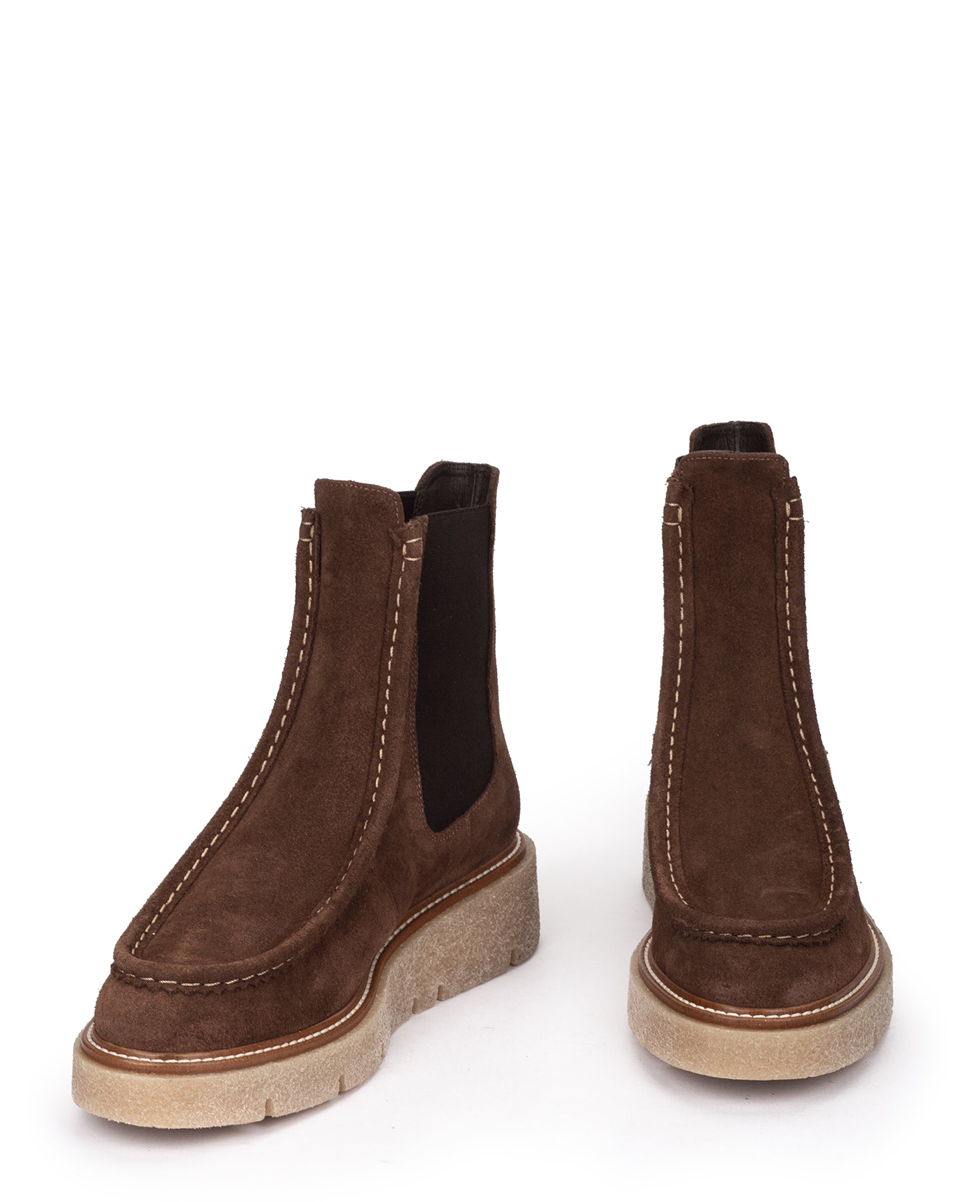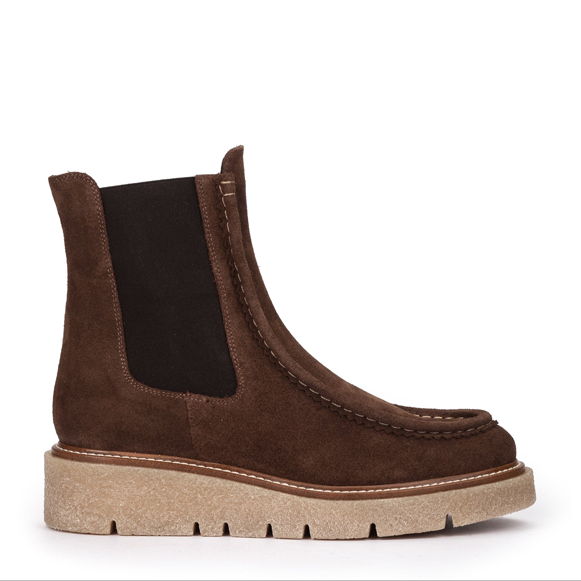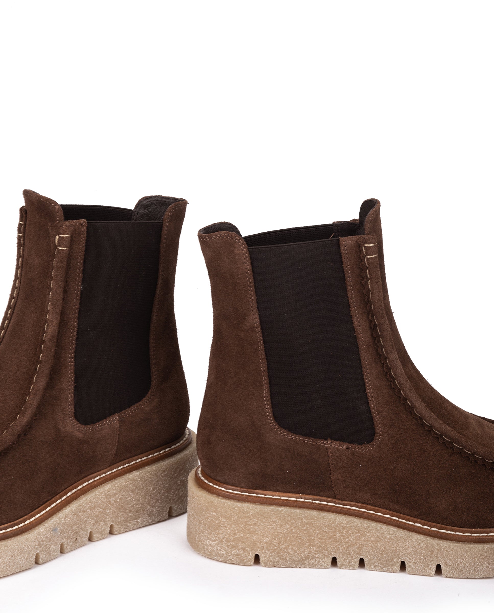 Botín chelsea de serraje en color marrón con elásticos laterales y suela gruesa en contraste. Un diseño casual y versátil, ideal para el día a día con un toque urbano.