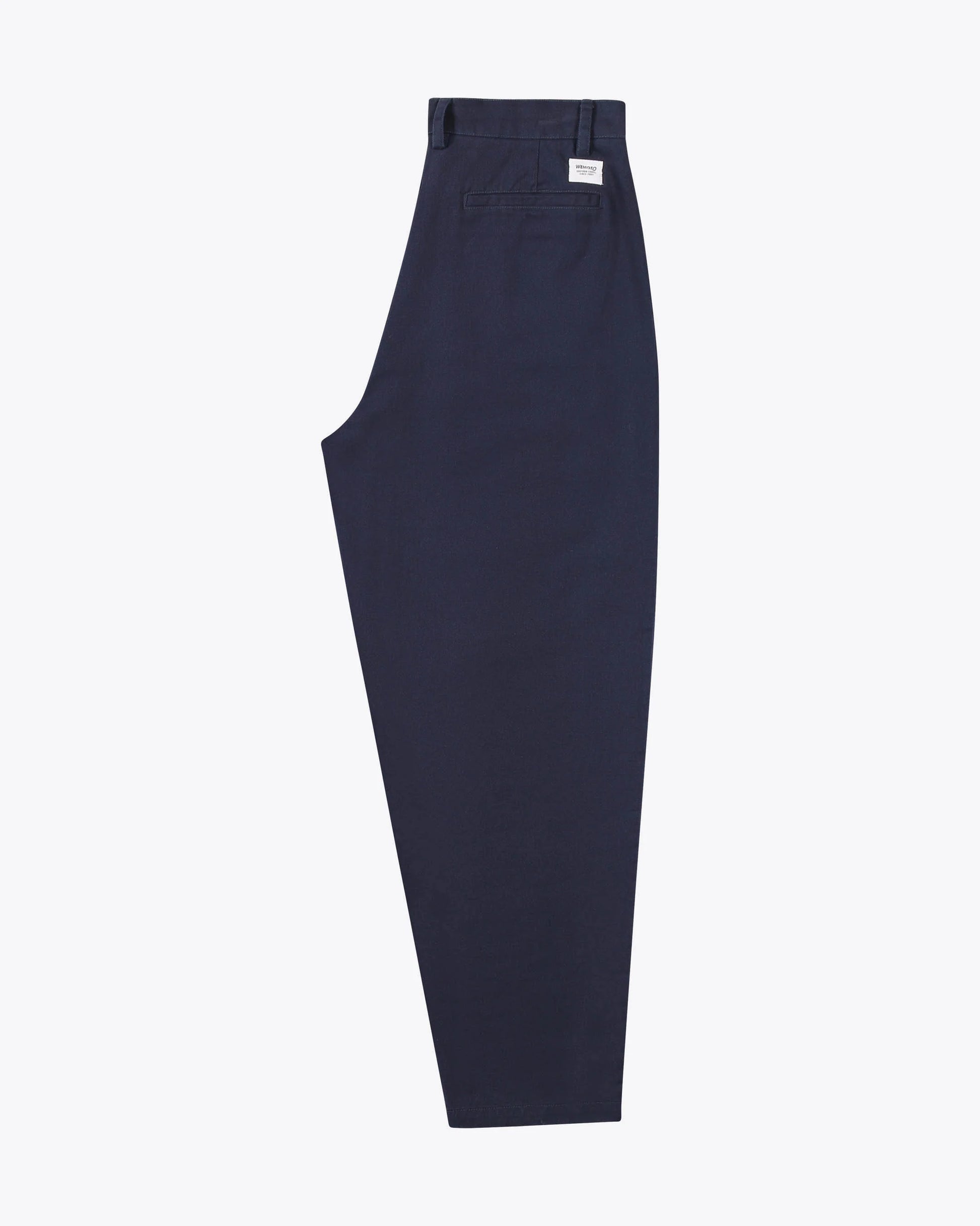 这款宽松裤型采用 275 克/平方米的 100% 纯棉斜纹布制成,常规腰部和阔腿设计,正面饰有褶裥,尽显精致。可调节抽绳腰带和标志性金属纽扣开合,时尚舒适,后侧配有贴边口袋。产品特性